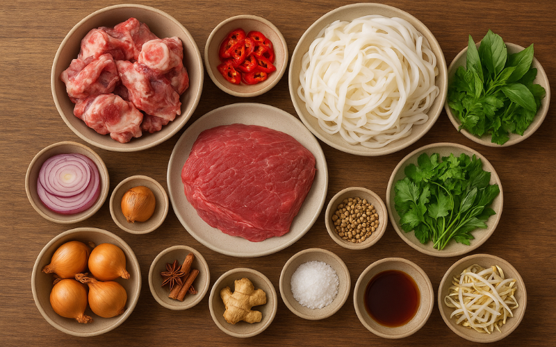 Chuẩn bị đầy đủ nguyên liệu sẽ giúp nước dùng phở ngọt thanh tự nhiên, thịt bò mềm ngọt và bát phở trọn vẹn hương vị truyền thống