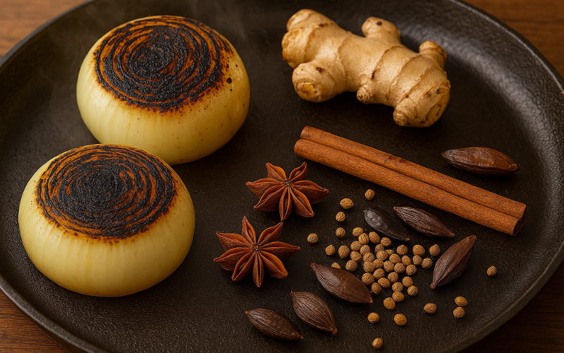 - Nướng hành tây, hành tím và gừng trên bếp than hoặc bếp ga cho cháy xém lớp vỏ ngoài, sau đó cạo sạch